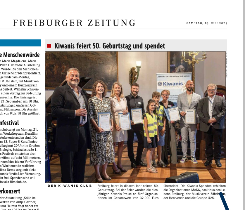 Jubiläumsfeier am 12. Juli 2025 im Historischen Kaufhaus. Rund 200 Gäste waren anwesend. Den Festvortrag hielt Freiburgs Erster Bürgermeister Ulrich von Kirchbach. Ausgeschüttet wurden insgesamt 32.000 Euro.